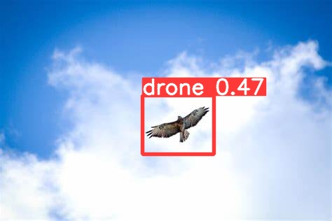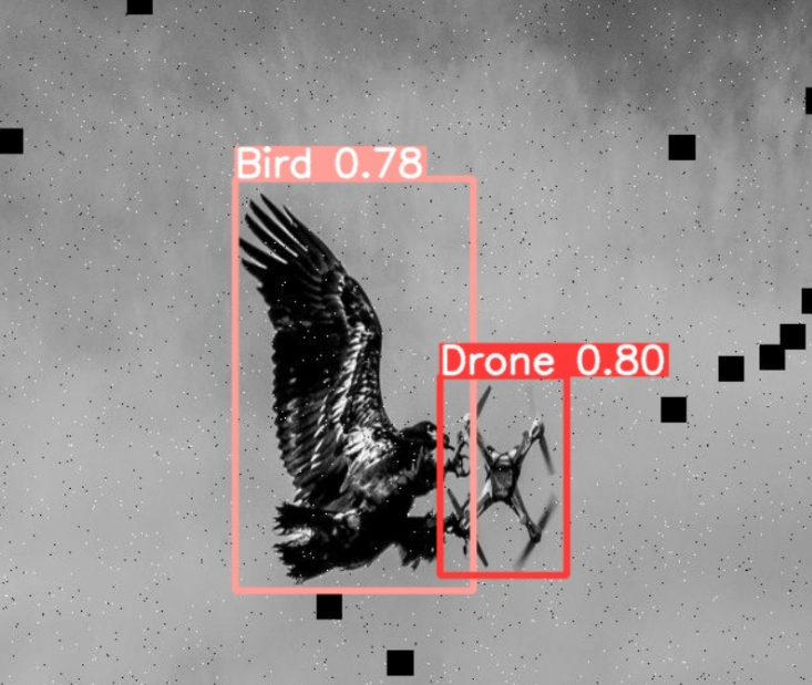 The model however incorrectly detected birds as drones as shown below. This could be a potential hassle during surveillance. We tried to resolve this by including birds in our dataset and adding it as a new label.