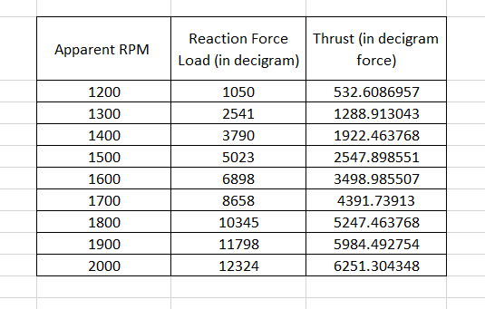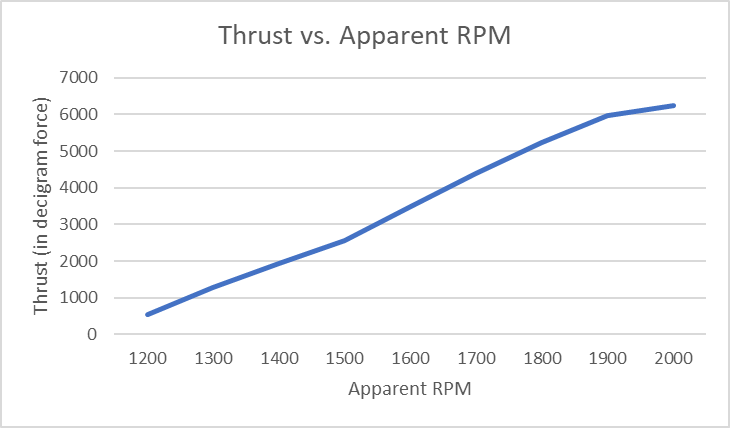 Here for testing purposes, we measured the Thrust generated by a thruster used in Drones. Then we made a plot of these values with an alias of RPM which we gave through the code called apparent RPM, where 1000 means minimum RPM and 2000 means maximum RPM.