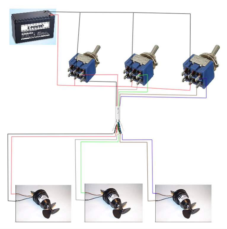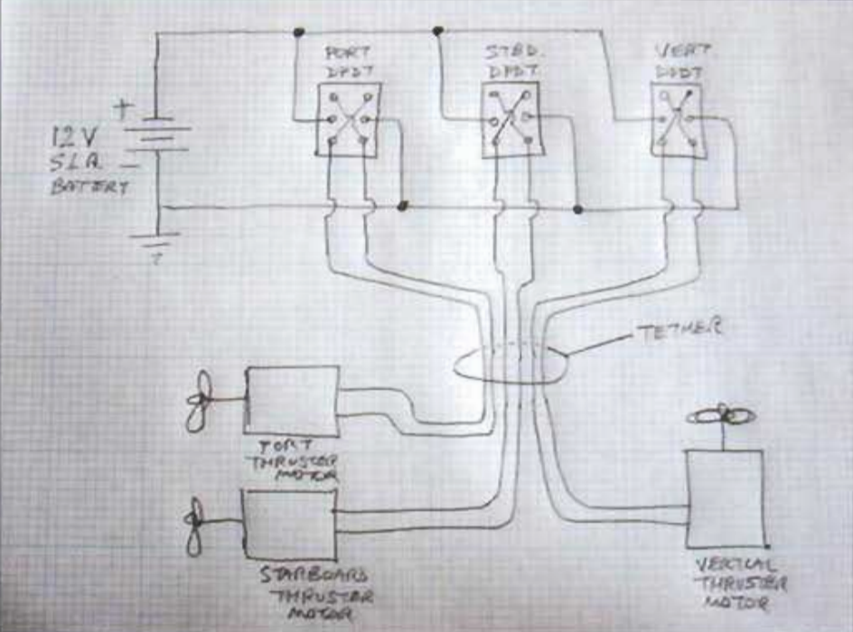 • This is a three-thruster arrangement: one for heave motion and the remaining two for surge and yaw motions(3 DOF). • The DPDT switches are used for: ◦ Switching the motors ON/OFF and ◦ Changing the sense of rotation of the motor. • The tether used here is well insulated and it consists of an ethernet cable with six lines(two for each motor) that control the working of the motor.