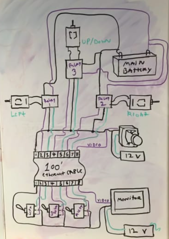 • Here, since the power supply is on the bot, we should use a different circuitry. The lower part of the above schematic is the operating/controlling end while the top part(w.r.t the tether) is on the ROV. • The user will be using DPDT switches as in the previous case but here, the power supply on the bot is connected to the thrusters through ‘Relays’ which provide the power to them based on the input of the operator. Also, there is power supply at the user’s end. • For the ROV, we are not working on the Camera part, so from the above schematic, it should be ignored.