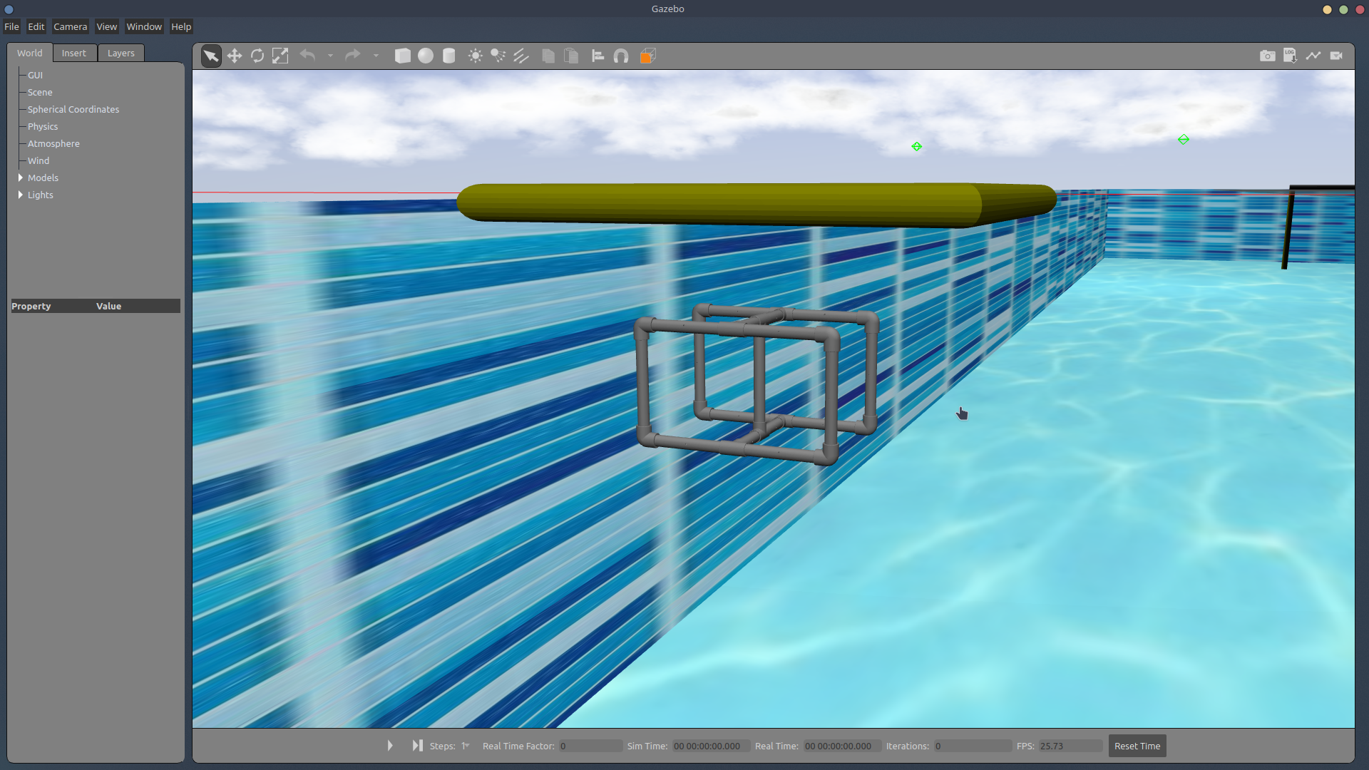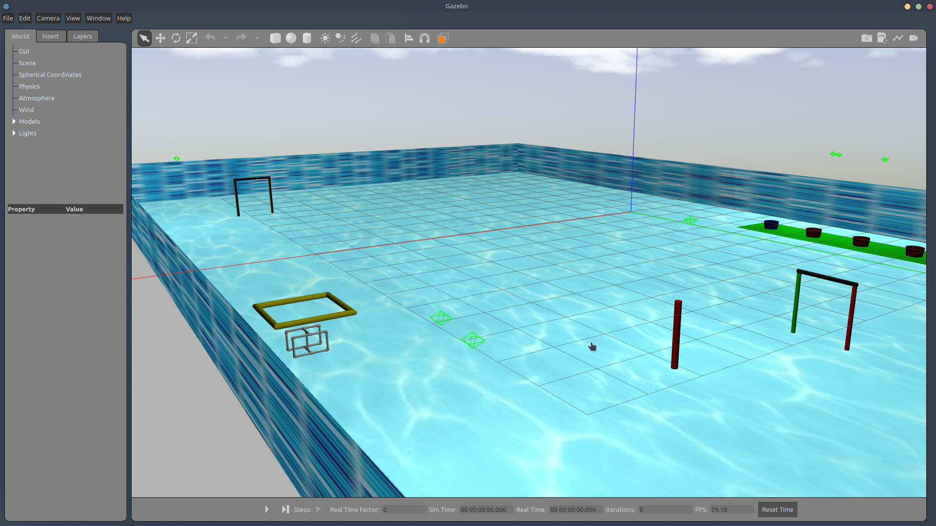 Environment - The initial environment consisted of an open ocean with objects such as a shipwreck. This environment was not enough to satisfy the simulations needed, so a pool environment called sauvc_pool which contained accurate information about the size of the pool as well as the obstacles and tasks inside the pool was implemented.