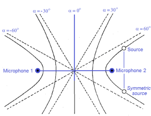 - The time difference between the two microphones is computed and used in estimating the position of the acoustic source.