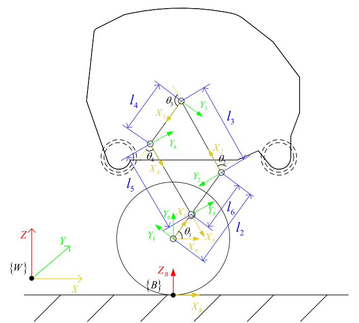 A parallel four-bar mechanism is being used as a new type of wheel-legged robot, and two controllers are designed to ensure stable motion - the linear quadratic regulator (LQR) and fuzzy proportion differentiation (PD) jumping controller. The robot is equipped with the ability to jump over obstacles and navigate rough terrain. The height of the jump trajectory adjusts based on changes in the link angle of the parallel four-bar linkage mechanism, enhancing the robot’s ability to tackle vertical obstacles.