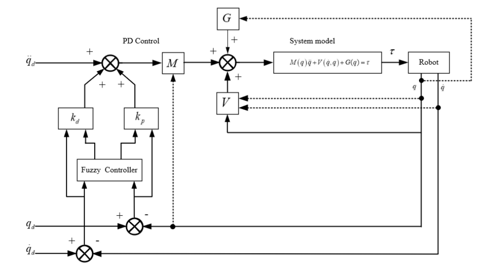 Fuzzy rules are made to tune the delta_Kp and delta_Kd values which get added to constant Kp0 and Kd0 values to get PD gains.