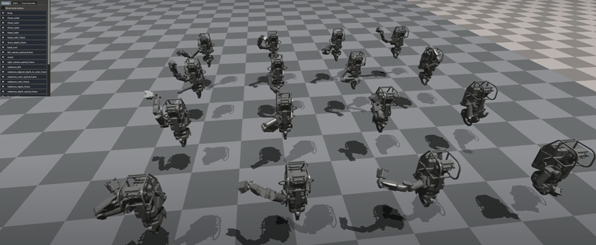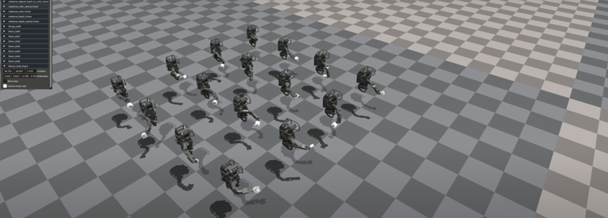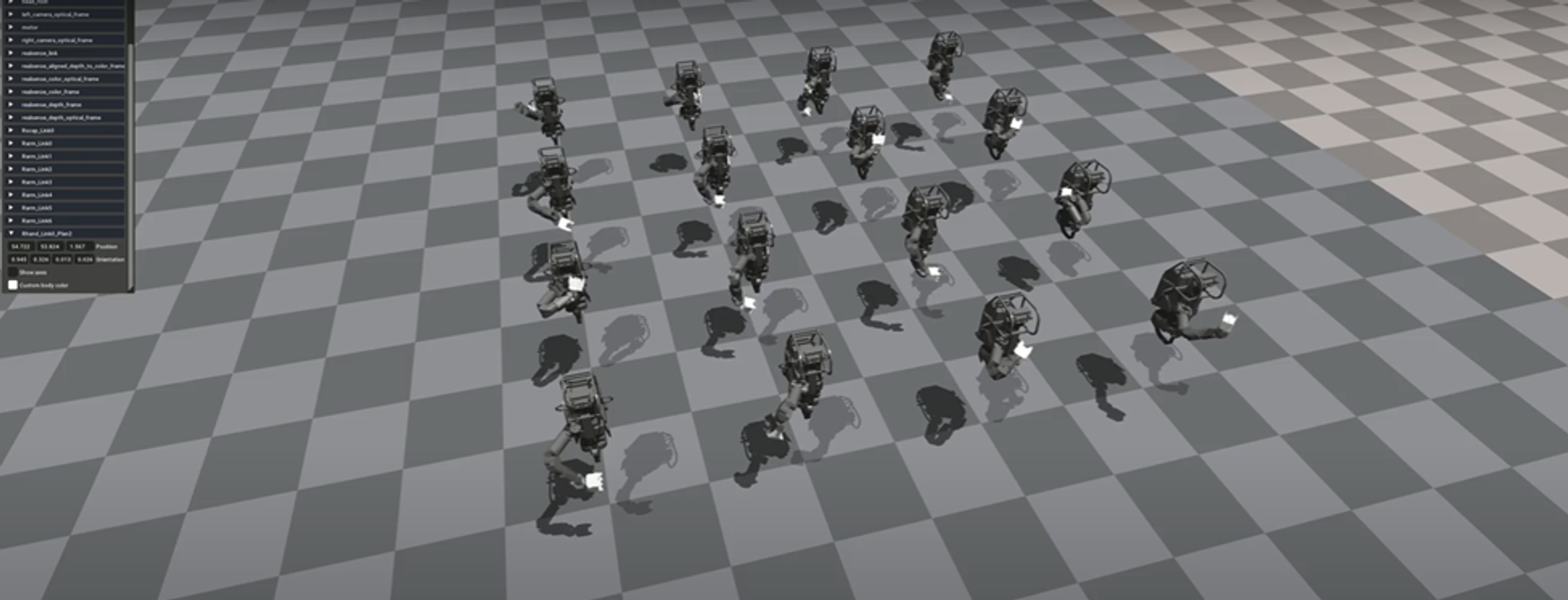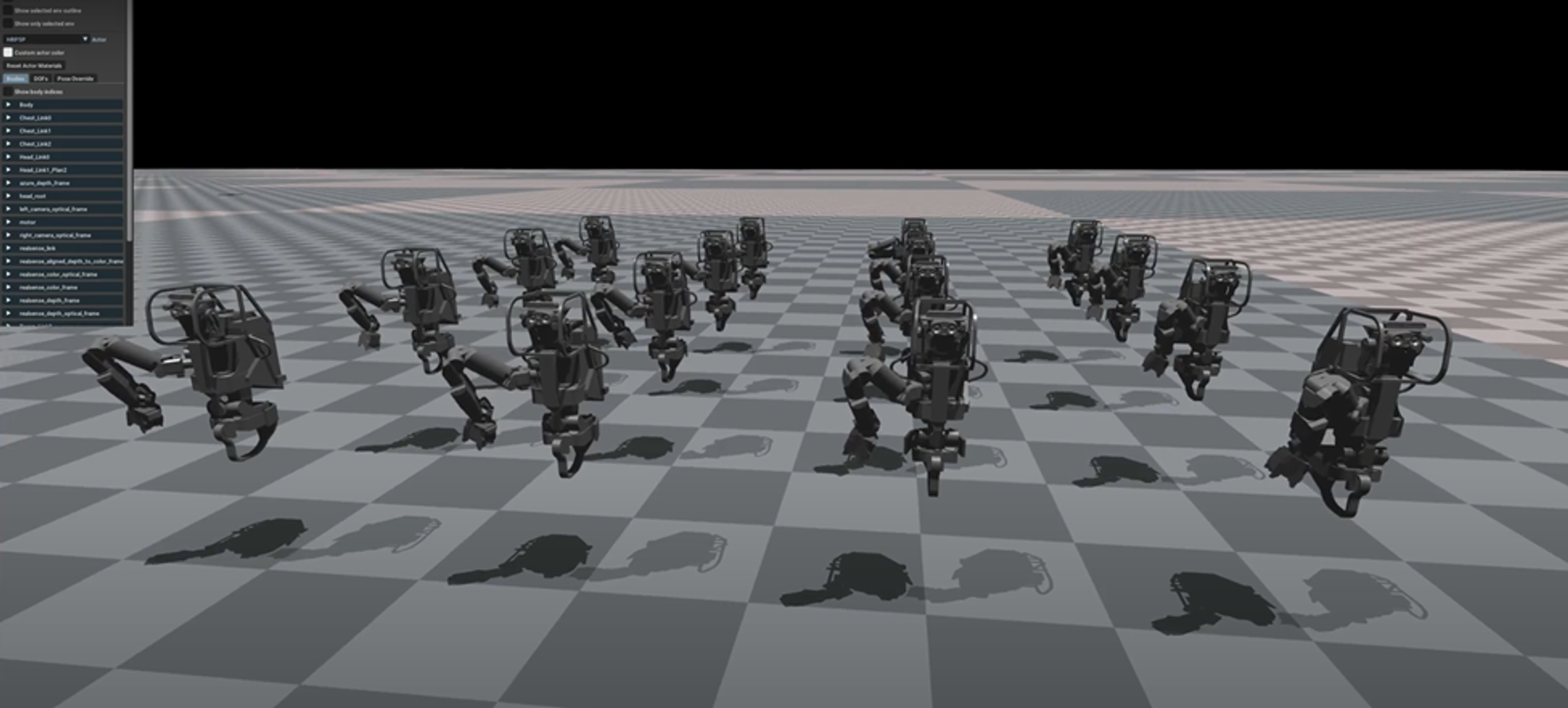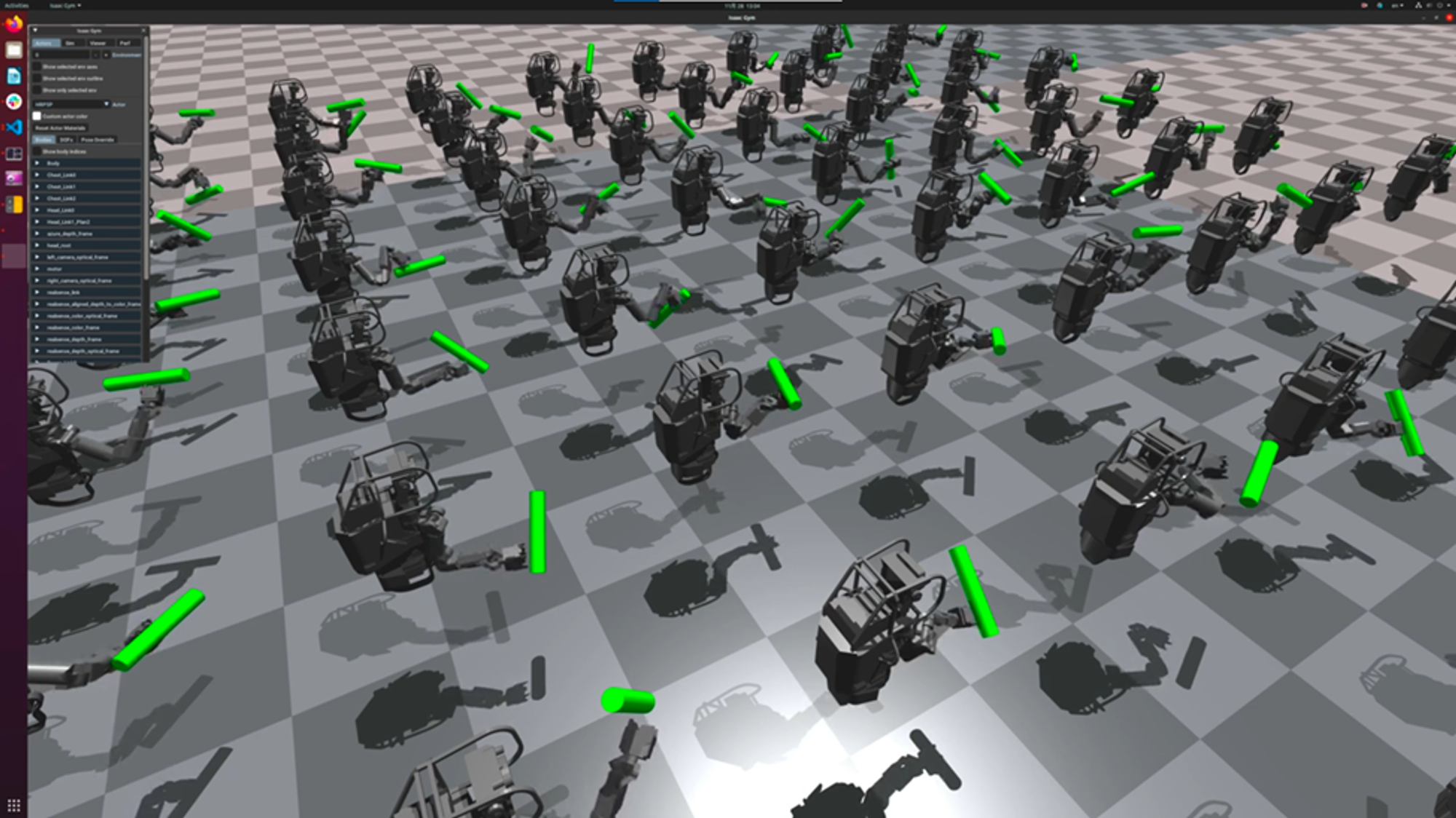 The simulation environment in Isaac Gym requires tuning of certain parameters pertaining to the physics engine and others specific to the model of the robot imported into the simulation. Values such as joint armature, joint position limits, joint velocity limits etc. need to be tuned to ensure a stable simulation of the robot in the environment.